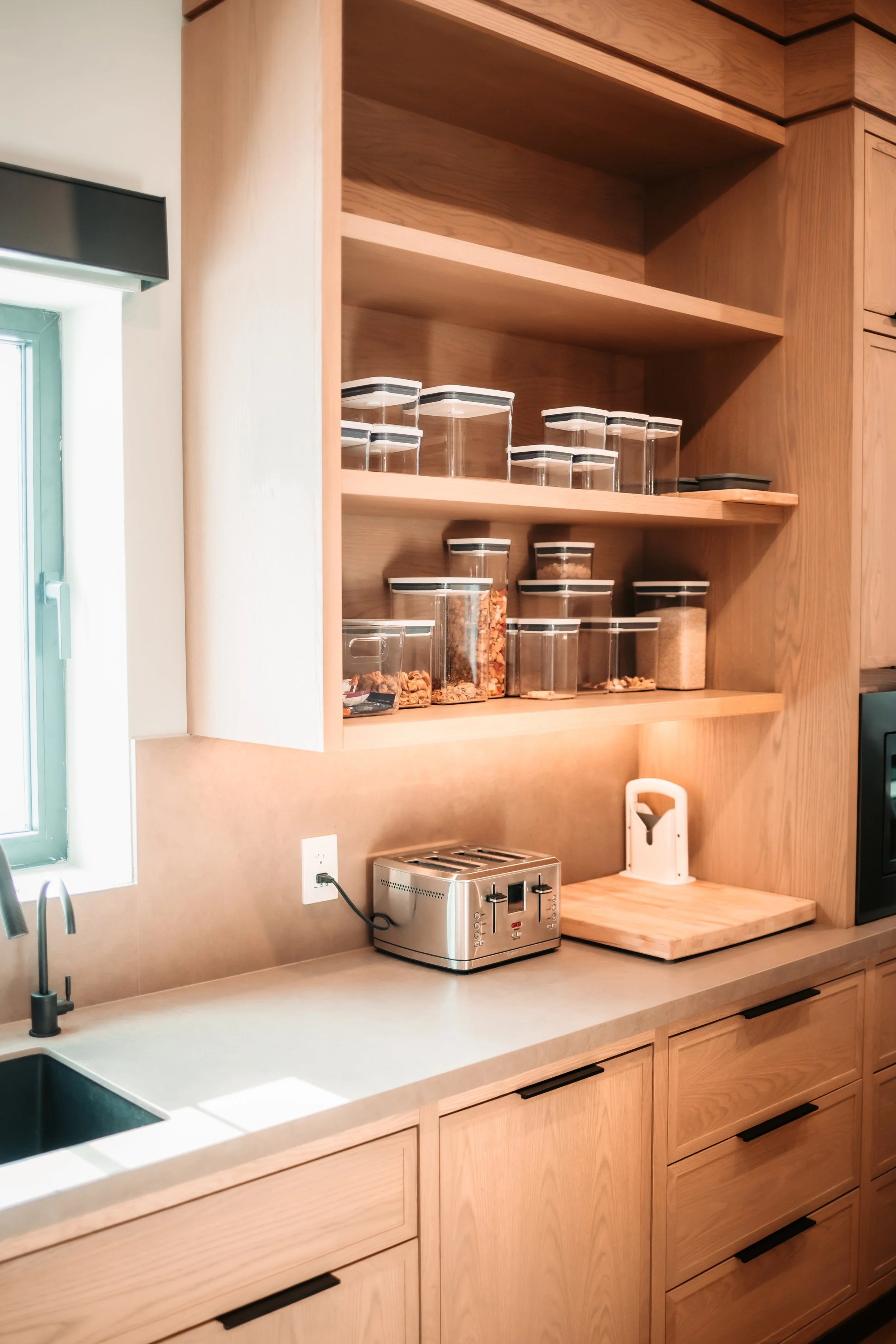 Fine custom kitchen, bathroom, pantry, and closet cabinetry with a full frame design and a mix of slim shaker, slab, and quarter round design.
